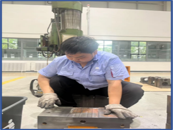 “足蒸暑土氣,背灼炎天光”,走進(jìn)車間,師傅們臉頰上混雜著汗水和黑色的印痕,淺藍(lán)的衣服早已變成深藍(lán)。即便如此,設(shè)備開發(fā)部師傅們也未曾有絲毫的懈怠,嚴(yán)肅的神情和精湛的技藝彰顯著工科人的細(xì)致和專業(yè):整齊擺放的物料嚴(yán)陣以待,調(diào)試好的零件精益求精。機(jī)器的轟鳴和師傅們的吶喊交相呼應(yīng),形成了盛夏中別具一格的交響樂。