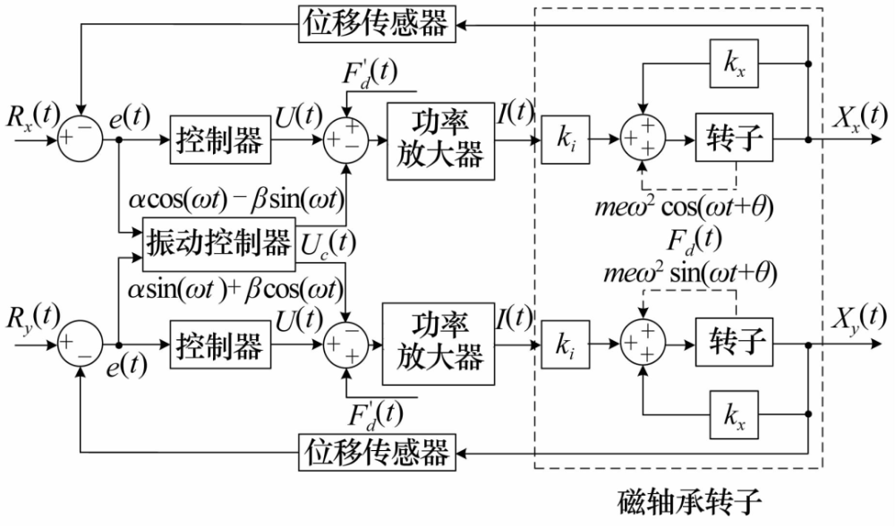 相對于軸承電磁力最小控制而言,轉(zhuǎn)子位移最小控制的復(fù)雜度較高,主要體現(xiàn)在實(shí)際系統(tǒng)不平衡力的大小和相位難以估計(jì)。不平衡力與轉(zhuǎn)子轉(zhuǎn)速ω、不平衡質(zhì)量m 、偏心距e等參數(shù)有關(guān),可表示為F(t)=meω2sin(ωt+φ),由于轉(zhuǎn)子轉(zhuǎn)速ω通常已知,如何得到不平衡力的幅值meω2和相位φ成為最小位移補(bǔ)償至關(guān)重要的部分。