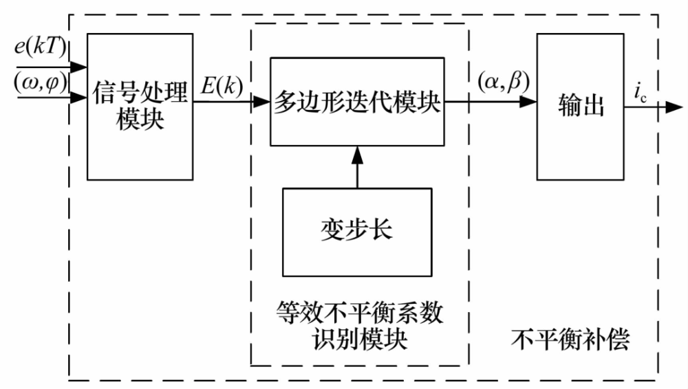 文獻(xiàn)[36]提出了一種可變步長( Variable Step Size,VSS)的迭代算法,其是對定步長( Constant Step Size,CSS)迭代算法的延伸優(yōu)化,控制方法如圖12所示,通過信號(hào)處理模塊、迭代模塊和輸出模塊不斷的迭代計(jì)算以找到不平衡力幅值的準(zhǔn)確解。2種算法的對比結(jié)果表明,VSS算法具有更好的準(zhǔn)確度和收斂速度,當(dāng)轉(zhuǎn)速升高且超過臨界值時(shí)CSS算法失去了補(bǔ)償效果,而VSS算法仍可進(jìn)行補(bǔ)償,能夠更好地抑制轉(zhuǎn)子跨階時(shí)的不平衡振動(dòng)。